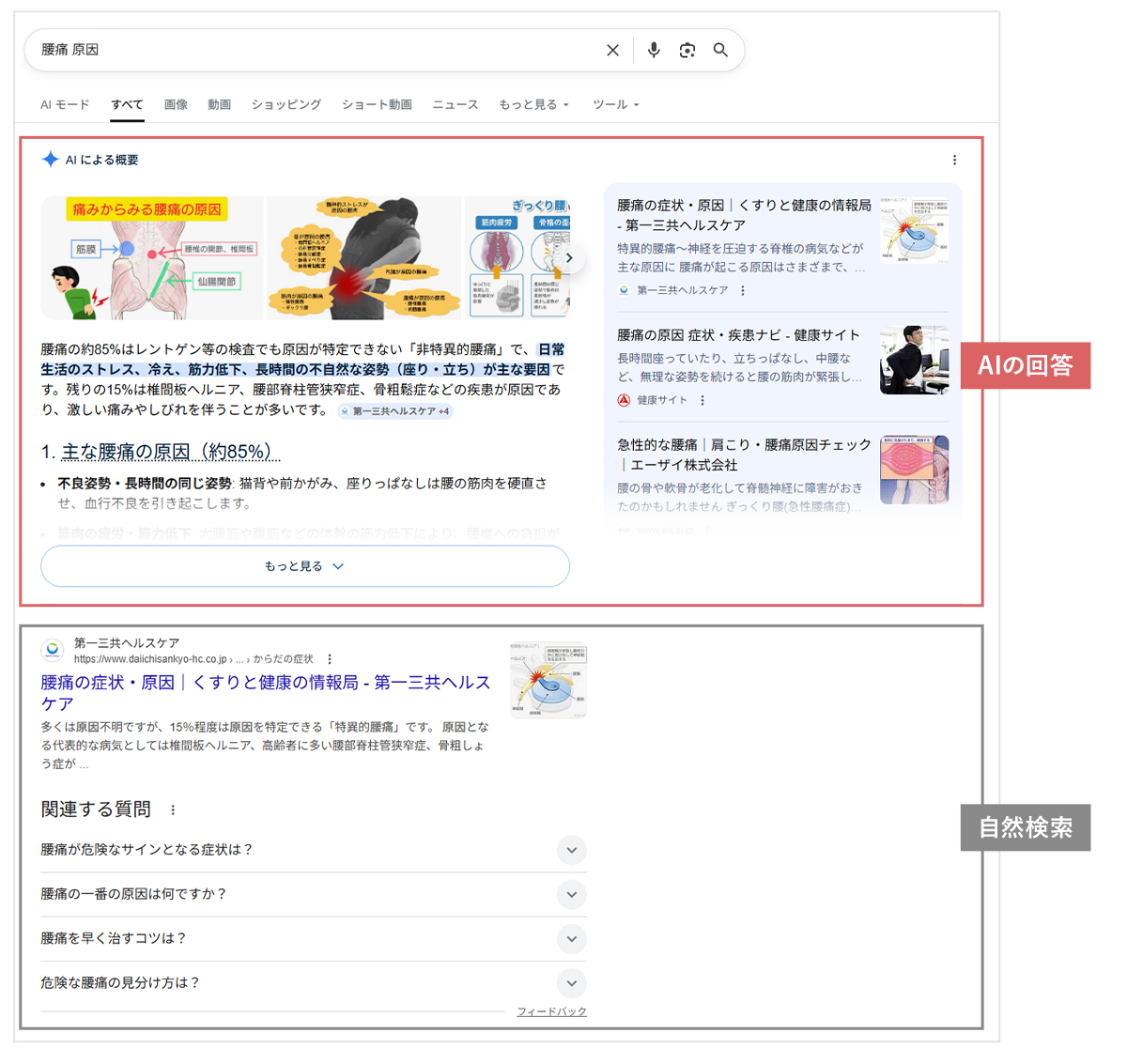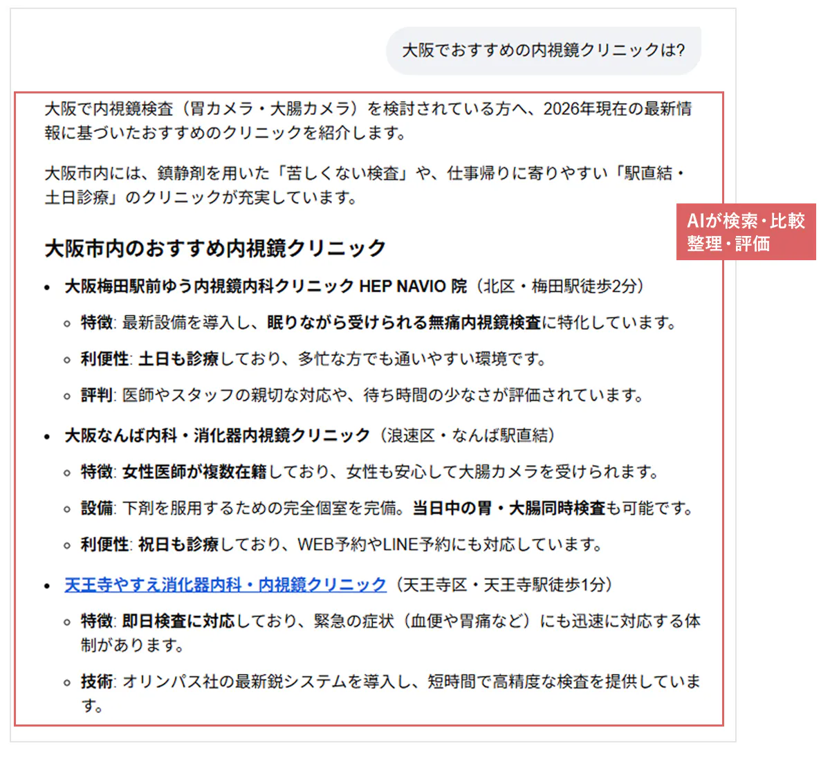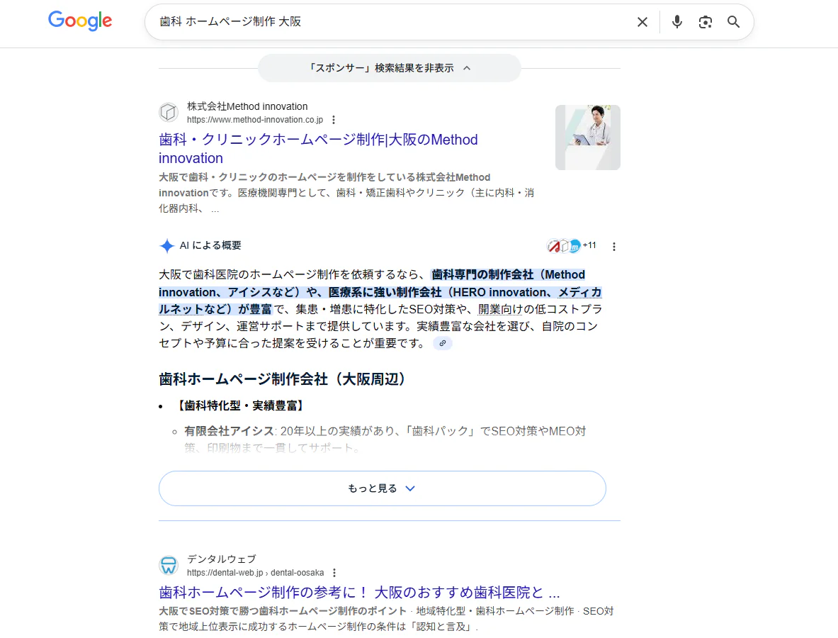 現在は、従来の検索結果の順位だけでなく、AIが自動生成した回答が検索結果画面の最上部に表示される事例が増えています。例えば、初期症状や受診先の相談などを検索した際、AIが生成した情報が真っ先にユーザーの目に触れるケースが多くなっています。この回答内で自院が言及されるかどうかは、従来の順位表示よりも影響力を持つ可能性があります。
